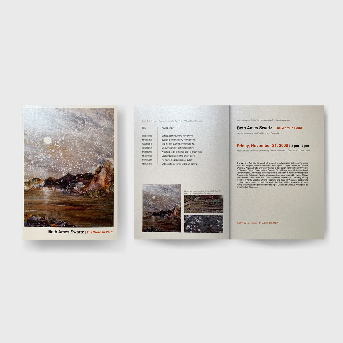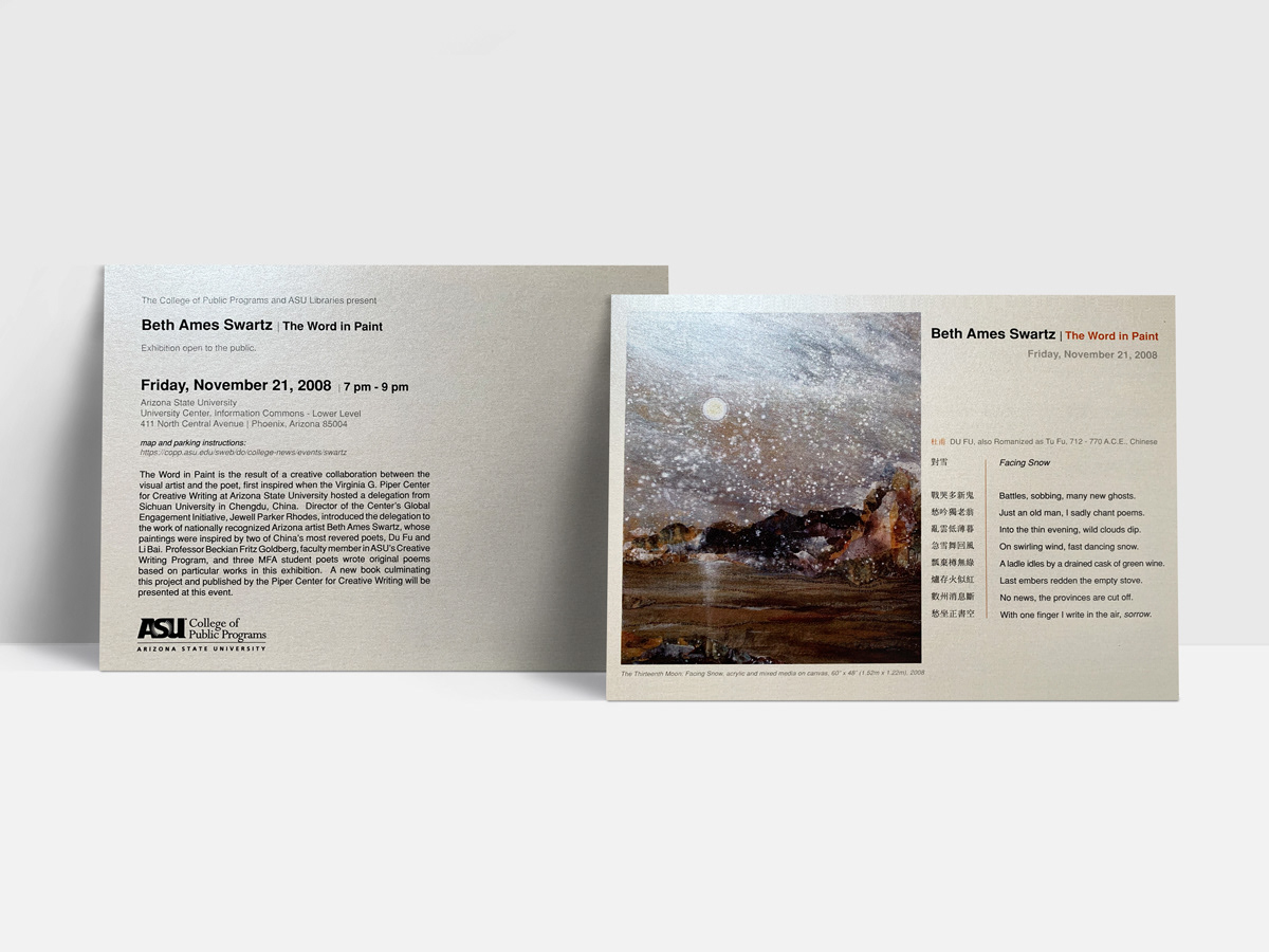 Design of the invitation and program for an artist exhibit and talk hosted by the ASU College of Public Programs. This project posed a unique challenge: integrating Chinese characters into the design while ensuring accurate translation and maintaining the overall format.