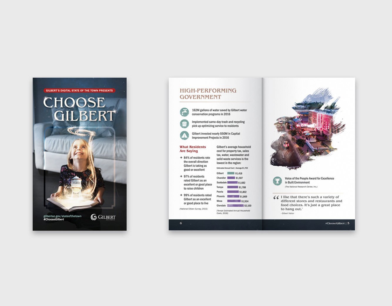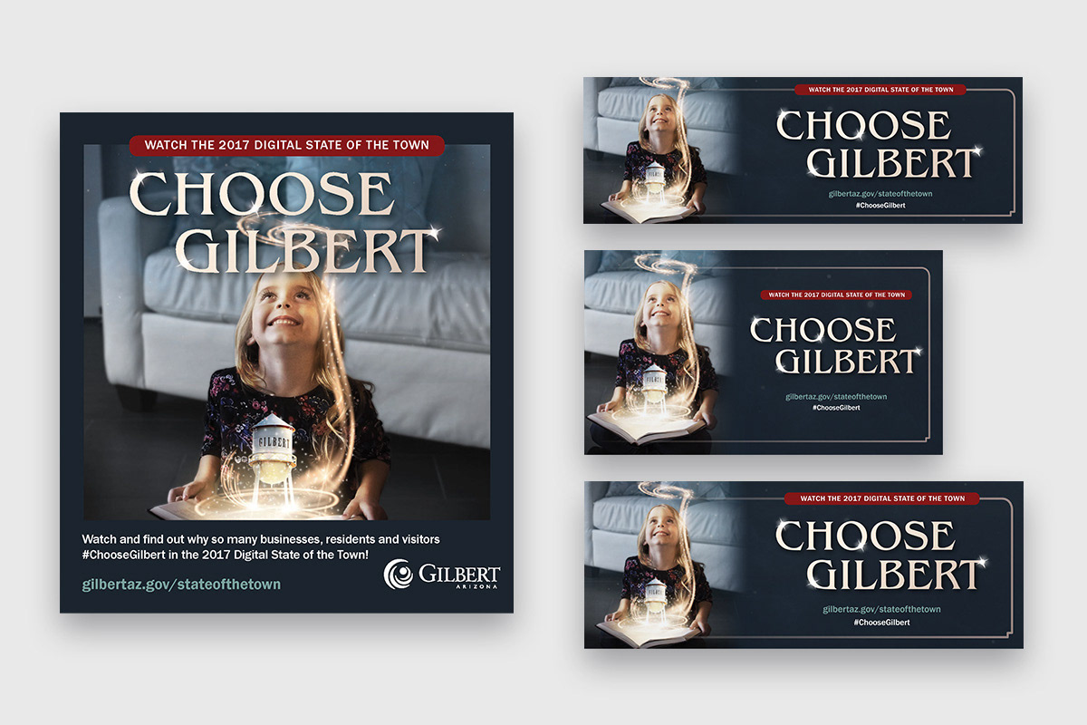 The 2017 Digital State of the Town “Choose Gilbert” is a documentary-style video showcasing why businesses, residents, and visitors are drawn to Gilbert. It features council members, contributions from residents, and business highlights. The accompanying program was distributed at the signature event and used throughout the year as a promotional piece.